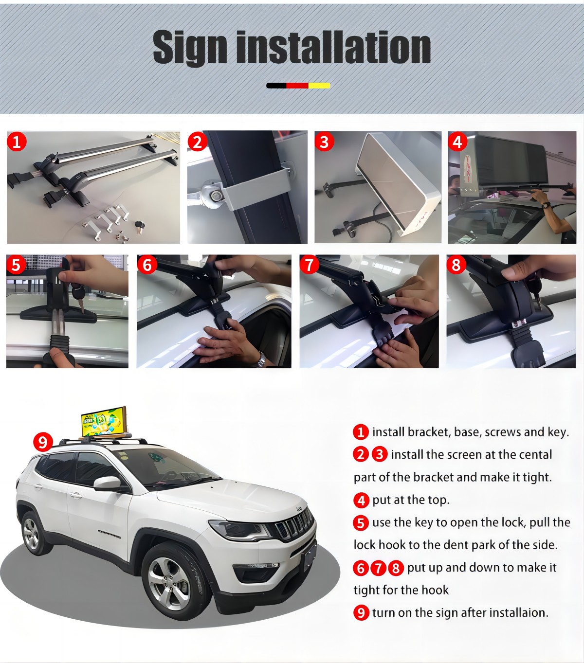 The car roof screen adopts high-quality light beads, the screen brightness is greater than 5000cd / ㎡, and the protection grade is IP65,