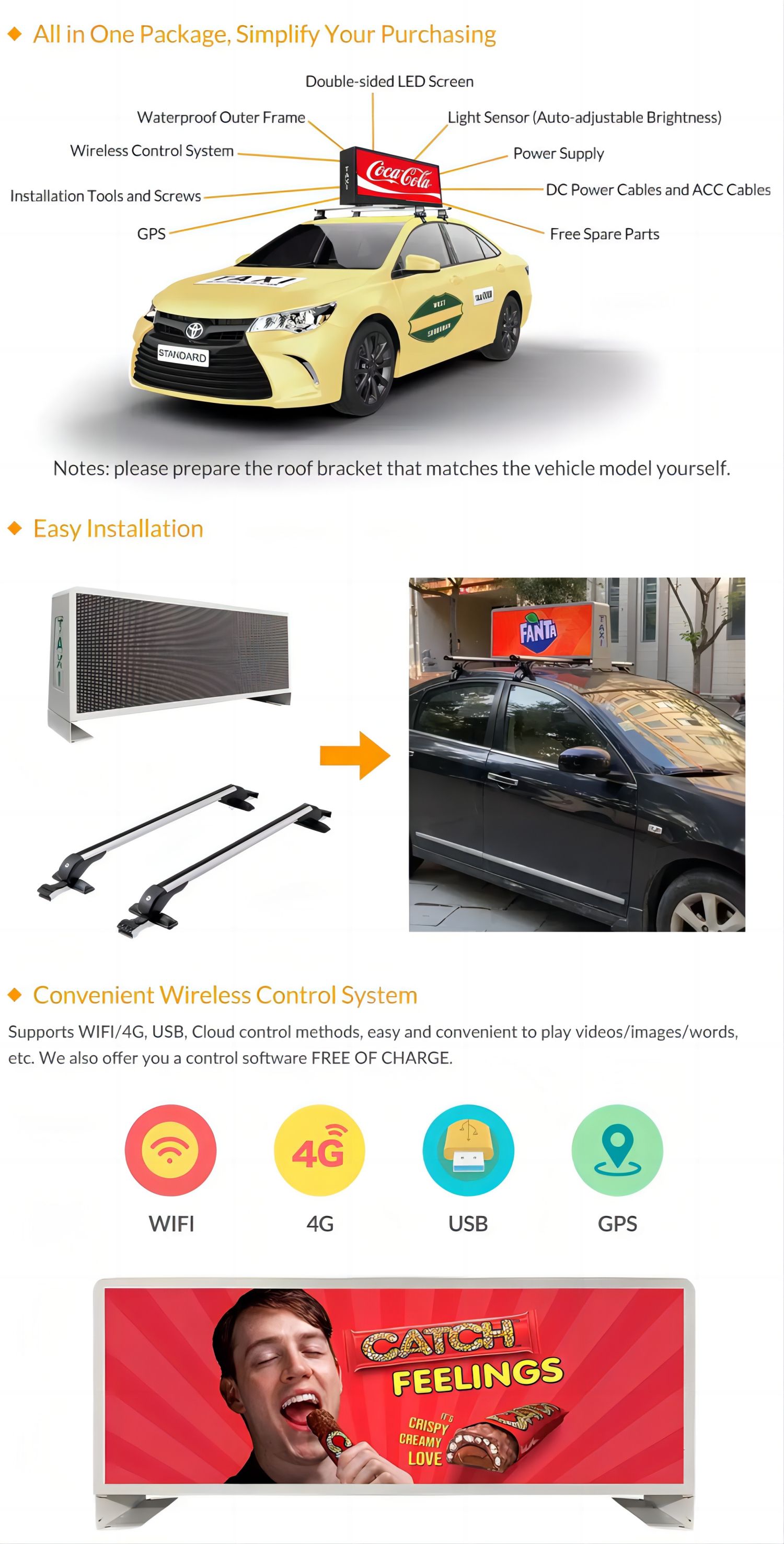 The car roof is mainly used for putting commercial advertisements, radio news, weather forecast, film and television information on taxis / cabs / cars.